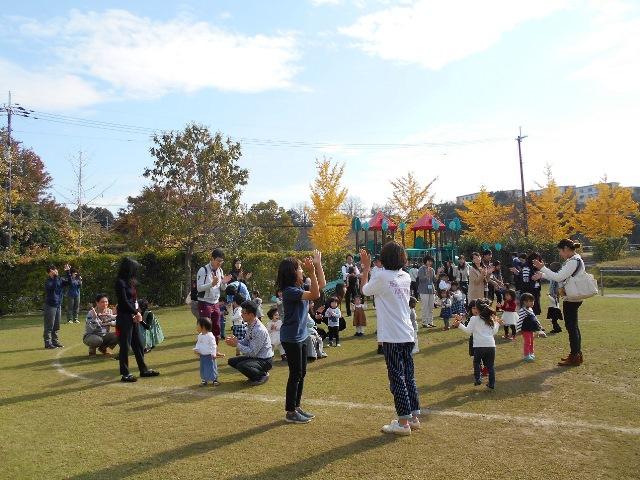 とても、いい秋晴れの日になりましたので、自由遊びをした後、芝生の園庭で、触れあい遊びや劇を観て過ごしました。