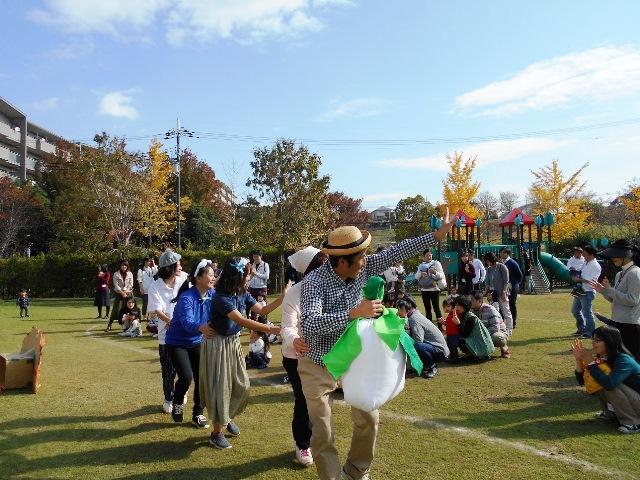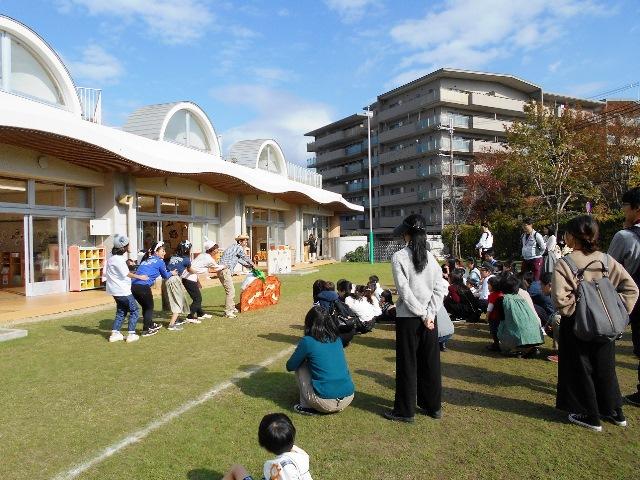 おじいさん・おばあさん・孫娘・ねこ・ねずみがどんどん増えていき、「うんとこしょ・どっこいしょ」とかけ声をかけるので、子どもたちもおうちの人もみんなで、かけ声をかけて下さいました。園庭全体が、舞台になって、楽しいひとときを過ごしていただきました。