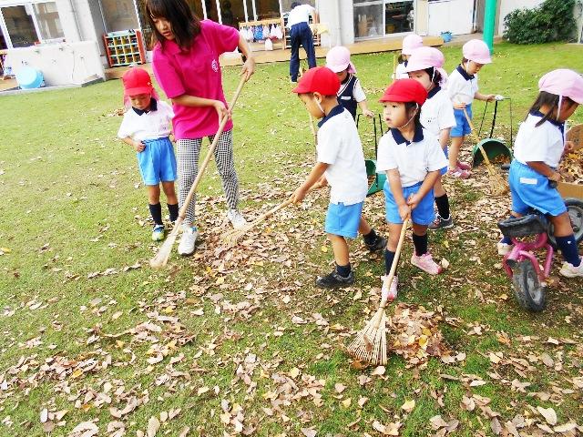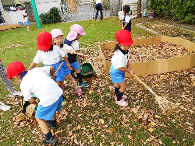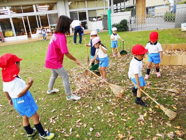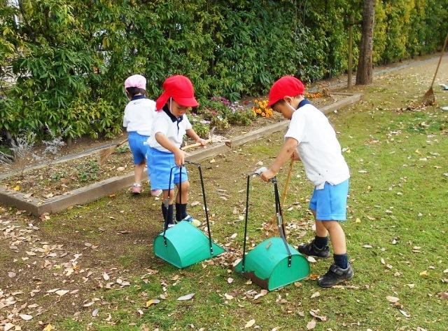 給食の後、小さな箒やちりとりを置いておくと子どもたちは、みんな大喜びで、落ち葉集めです。「明日もまた、あそぼうね」「葉っぱが、なくなっちゃうとプールに入れないから、集めようね」と言いながら、三歳児の小さな手で、箒を上手に使っていましたよ。