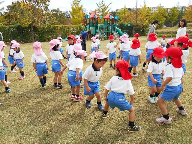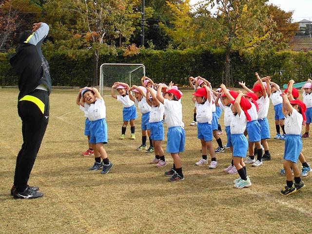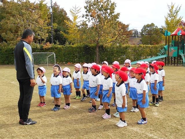 体育の先生が、次は何を言われるのかとドキドキわくわくしながら、待っています。一人一人に先生の指示が通るのを観て、年少組の子どもたちも良く育っているなあと嬉しくなってしまいます。