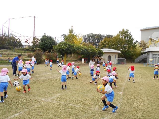 今日は、足じゃんけんで、ゲームをしたり、「ボールを上に放っている間に、二つ手をたたいて受ける」といったむつかしいことをしたりしていましたが、先生が楽しい言葉がけや表情で促されるので、「むつかしい」とか「無理」とか言う子は、誰もいません。