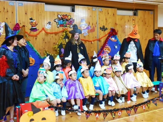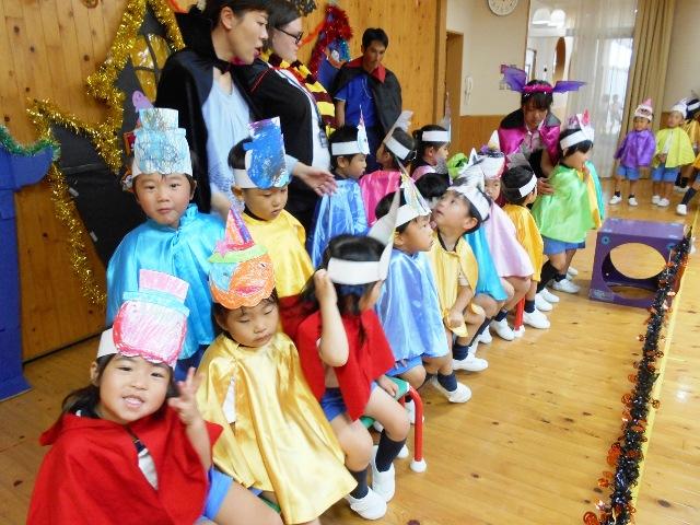 シーナ先生もアンバー先生も、ハリーポッターの衣裳をつけて、魔法使いになっていました。子どもたちは、それぞれハロウィンのお面に、好きな色をつけて、マントを羽織って仮装してみました。