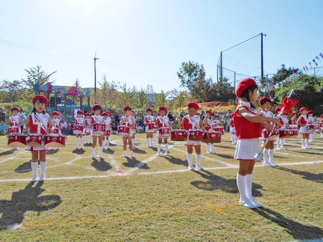 マーチングは、年間を通して行っていますが、マーチングの先生のプログラムによって、一学期から少しずつ少しずつ仕上げてきました。夏の暑い間は、空調の効いた遊戯室や保育室で、太鼓を持たずに隊形移動やリズムの打ち方を教えてもらいました。担任は、子ども一人一人に励ましの言葉を発しながら、意欲的な態度を引き出していました。