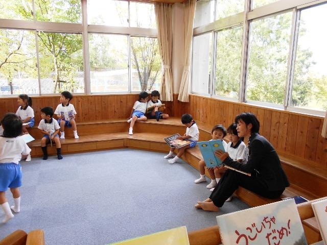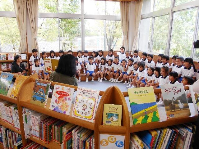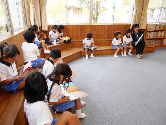 年中児が、奈良学園小学校の図書室で図書館司書の先生や校長先生に絵本を読んでもらいました。