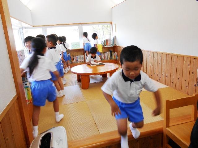 子どもたちは、「小学校の図書室は、いっぱい本があって、楽しいねえ」とたくさんの絵本に触れていました。