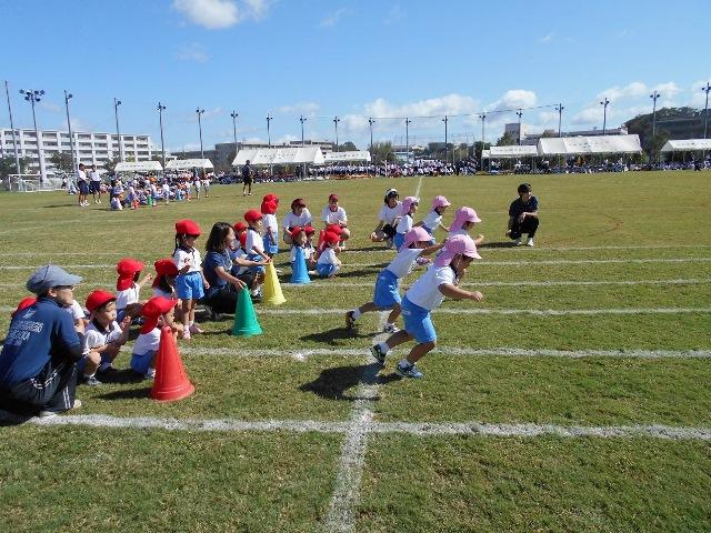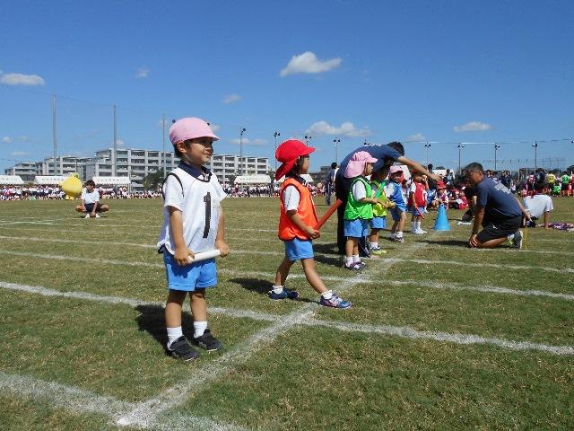 年少児も年中児も慣れないグランドでしたが、頑張ってかけっこや小学生との競技を楽しんでいました。