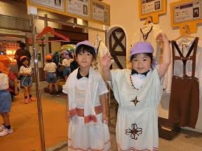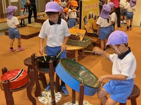 年中組は、民族楽器をたたいたり、いろいろな国の衣裳をまとったりして、遊びました。