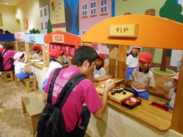 お買い物プラザやおまわりさんや郵便屋さん・お医者さんにカットハウス・工事現場など様々な体験があり、衣裳もつけて、楽しみました。