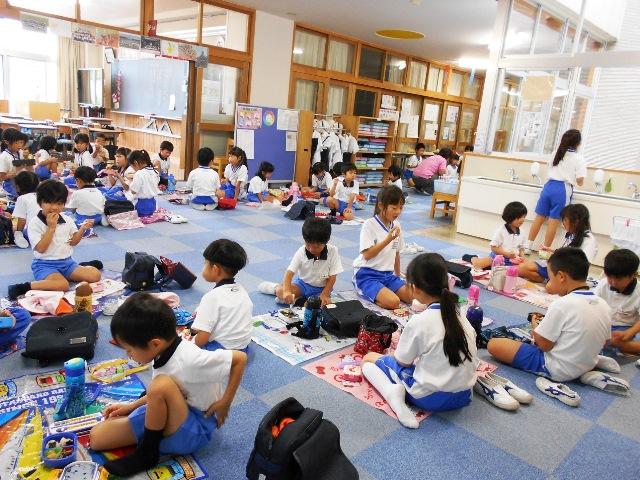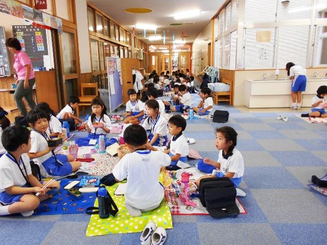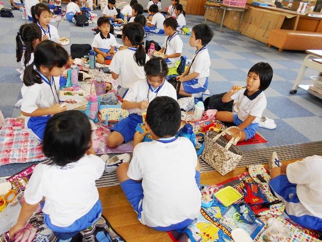 小学校2年生の教室とオープンスペースで、お弁当交流をしました。