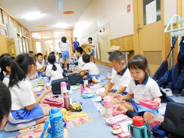 年中組の子どもたちは、ちょっとドキドキしながらお弁当を持って小学校へ行きました。