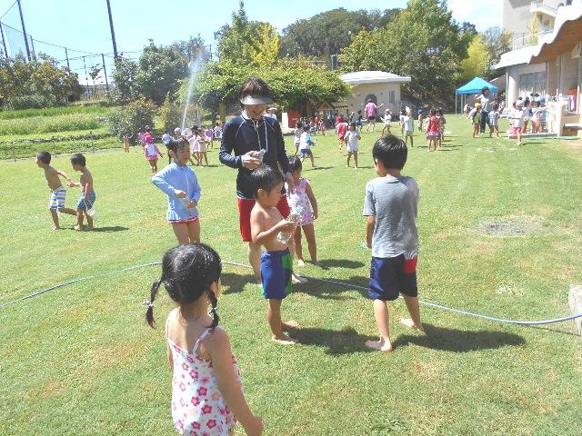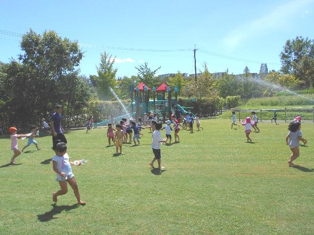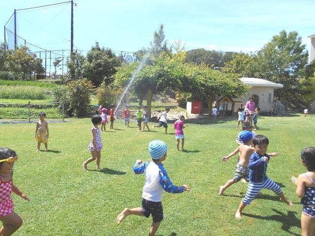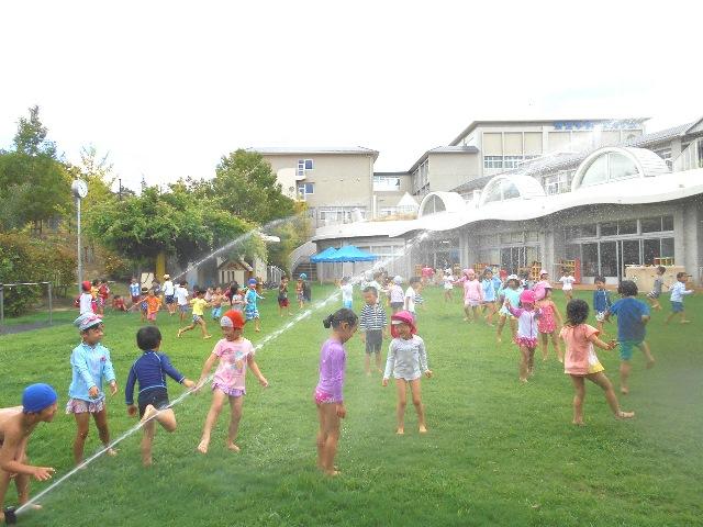 水に濡れるのを気にせず、園庭中に回転しながら巻かれるスプリンクラーからの散水を追いかけて、のびのびと身体を動かせて走り回る子どもたちの顔は、生き生きとしていました。