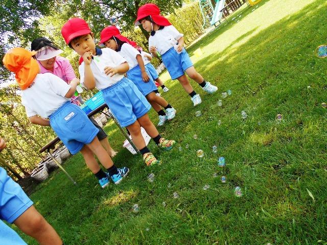 うまく吹けなかったシャボン玉も、できるようになりました。芝生の上に落ちたシャボン玉は、なかなか消えません。どうしてだろう?不思議です。