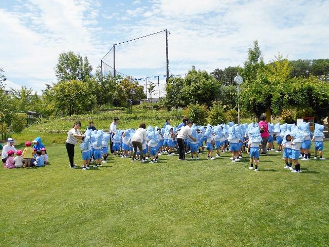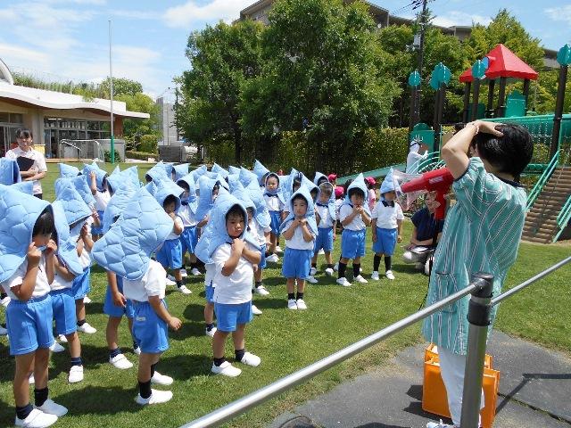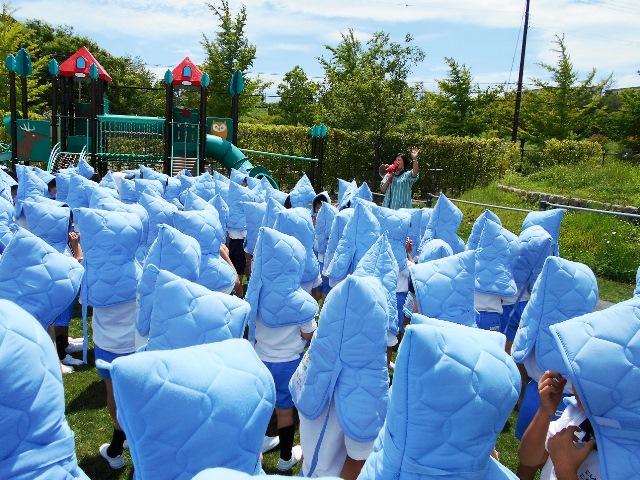 喫緊に防災ずきんを被る練習をしていましたので、年少児も戸惑うことなく、防災ずきんを被ることが出来ました。先生たちに、「練習をすることによって、安心できるのだ」ということを聞いていたので、怖がる子もいなくて良かったです。