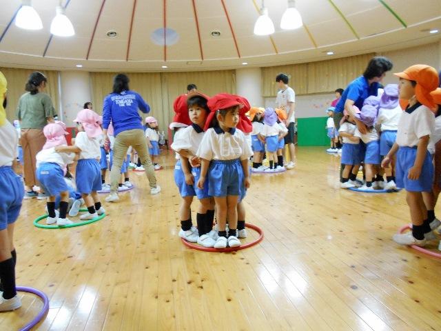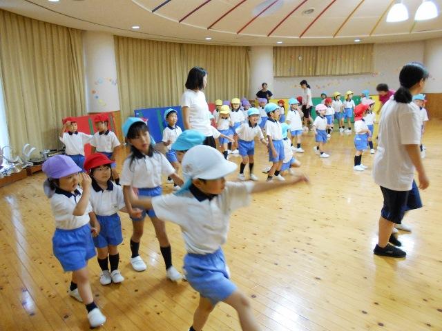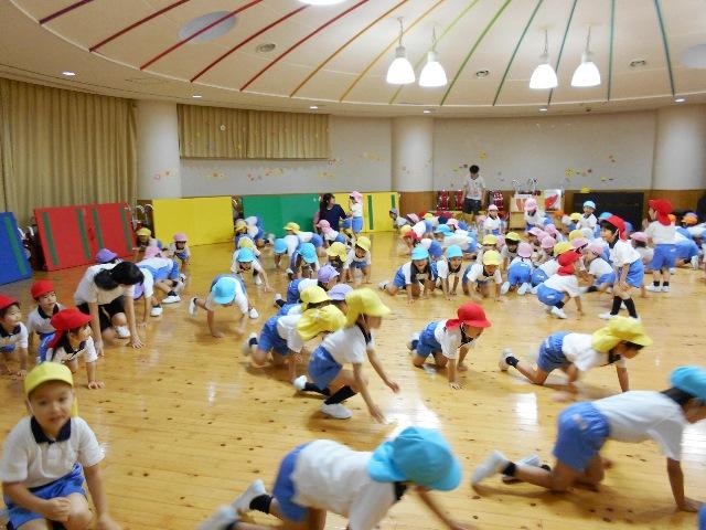 5月31日 今日は、雨だったので『わくわくタイム』は、遊戯室でしました。全園児で、体育の先生と一緒に10分間体育です。