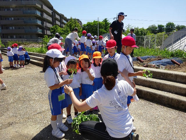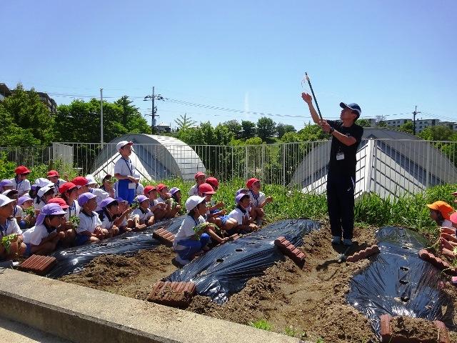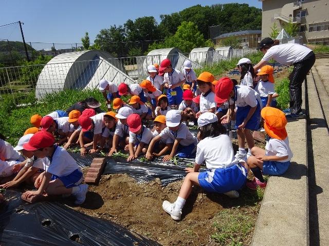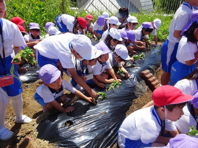 小学校2年生の子どもたちが、先日一緒になったグループで、年中児に優しくサツマイモの苗植え方を教えてくれながら、植えました。
