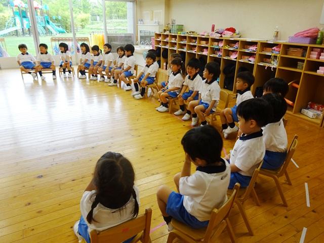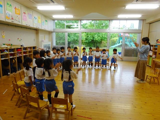 年少組は、自由遊びの片付けが終わってから、朝のご挨拶をします。