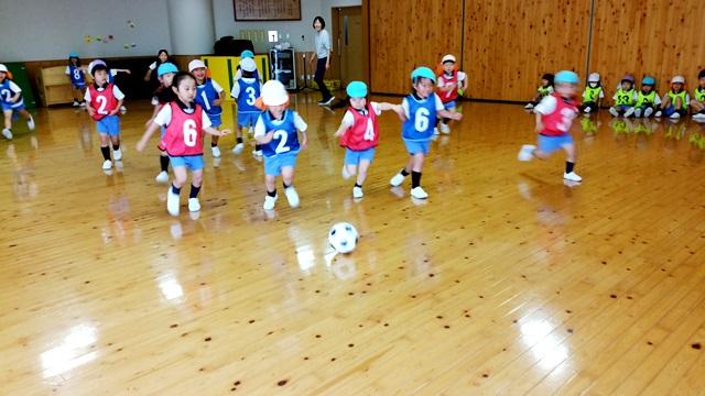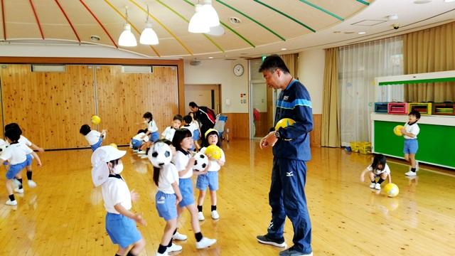 みんな、三笘先生が大好きで、大はりきりで、サッカー遊びをしました。ちょっとむずかしいボールさばきも、「無理」なんて言わないで、その子なりの力量で頑張ります。三笘先生は、楽しい雰囲気の中でサッカーのルールや基礎を体験的に教えてくださいます。