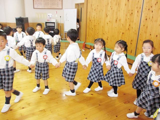 年長組さん・年中組さんが、拍手で出迎える中、「どきどき・にこにこ」しながら年少さくら組さん・もみじ組さんが、ホールに入ってきました。