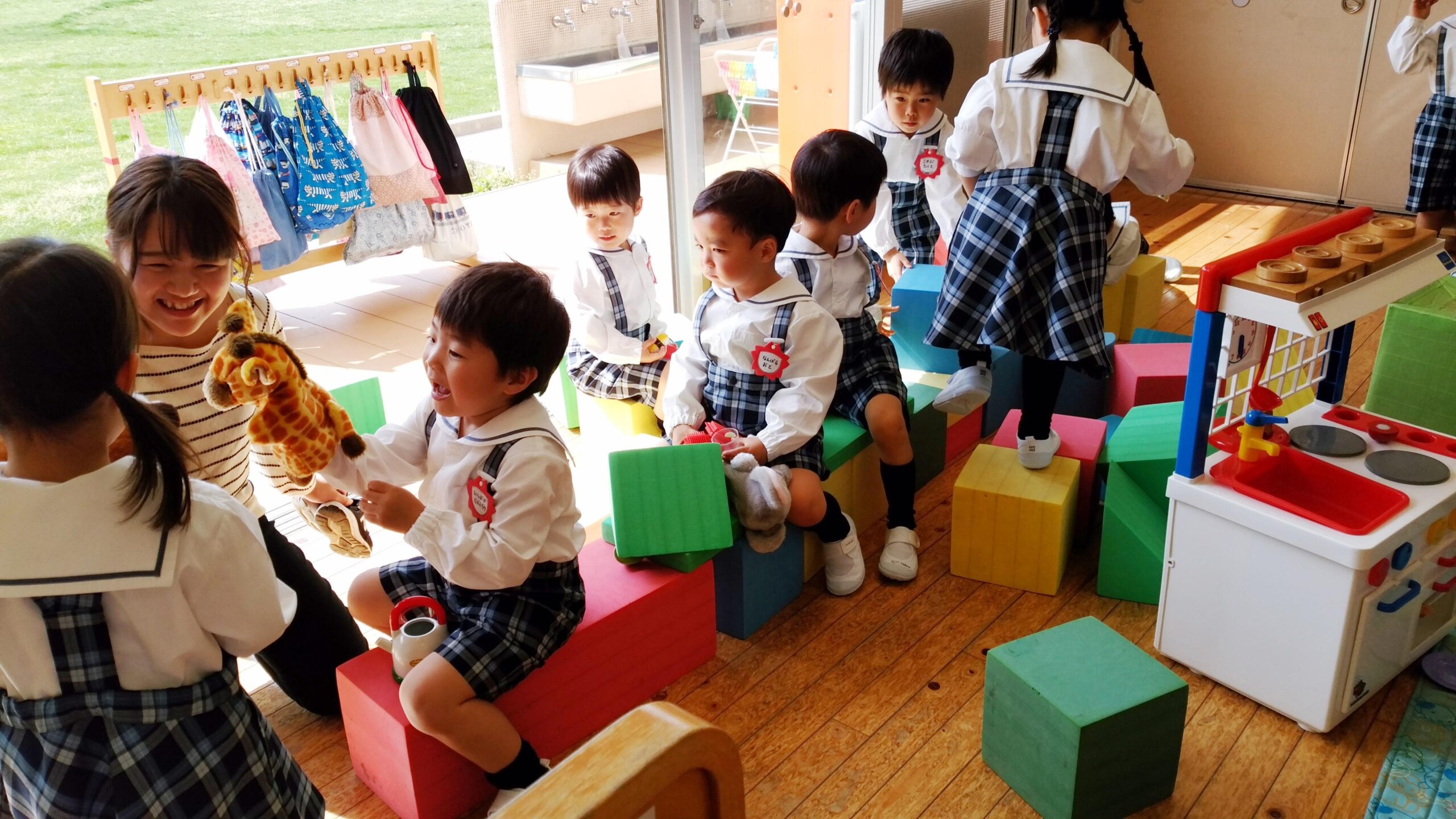 年少組の「もみじ組」「さくら組」のおともだちは、それぞれ個々の遊びをしているようですが、同じ場所で、同じ遊びをしているとまるで、でんしゃごっこしているみたいでしょ。本当は、電車や消防自動車・バス・車とそれぞれに違う乗り物に乗っていると言っていましたよ。
