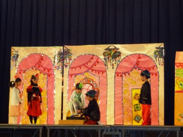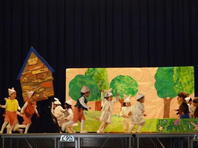 5歳児は、幼稚園での最後の発表です。登場人物の心情を感じながら演じることができるようになってくるのが5歳児です。いじわるなお妃と子どもたちの会話もその役らしく演じるので見ていてとても楽しいです。