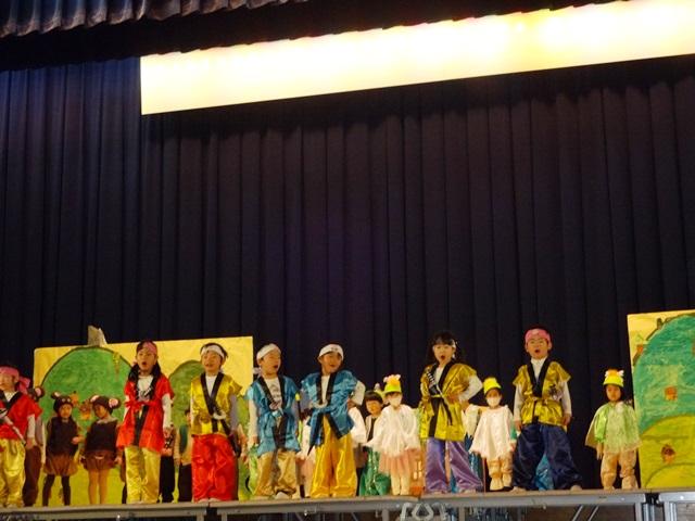 4歳児は、堂々と演じています。役になりきって言葉を伝えたり、表現したりできるようになってきました。鬼の宴会や鬼と桃太郎・犬・猿・雉の戦いの場面は子どもたちも大好きです。お楽しみに。