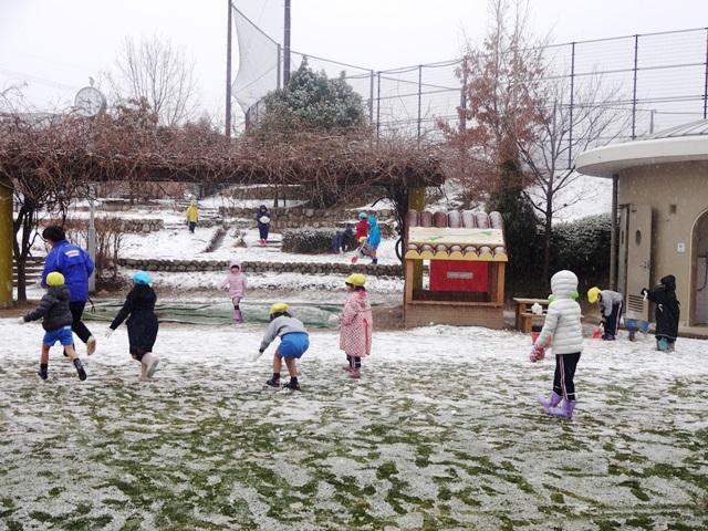 1年中で空気が一番冷たいこの時期、「雪が降らないかな」と待っていた子どもたちに空からの贈り物が… 明け方から降った雪で園庭は銀世界♪ 登園してきた子どもたちはうっすらと雪が積もる園庭に飛び出していきました。雪玉を作って雪合戦♪先生を追いかけ「それー」と投げます。「キャー助けて~」先生も子どもを追いかけます。顔を真っ赤にしてみんなとっても楽しそうです。