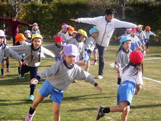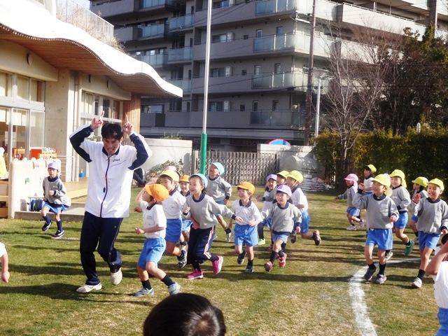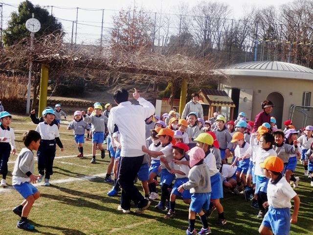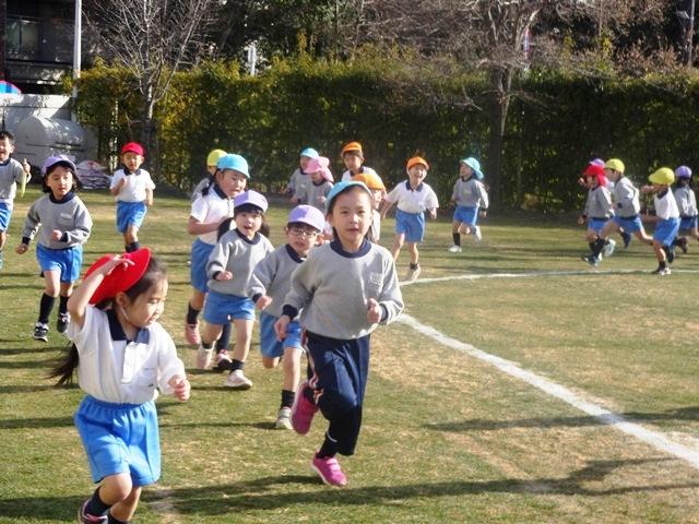 登園し、着替えを済ませた子から園庭に集まります。体育の先生のかけ声でみんな走ります。寒さなんてへっちゃら。元気いっぱいの子どもたちです。異年齢が一緒に集う時間です。年長の子どもたちの年少児を見守る眼差しが温かいです。