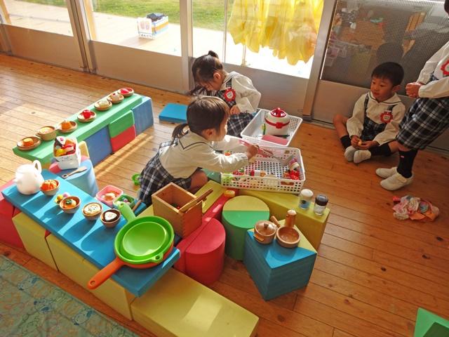 各保育室では、楽しい遊びが繰り広げられていました。おうちをつくって、ごちそうをいっぱい並べ、友達をおもてなしする子、きっと、お正月に美味しいごちそうをたくさん食べたんだなと思いました。