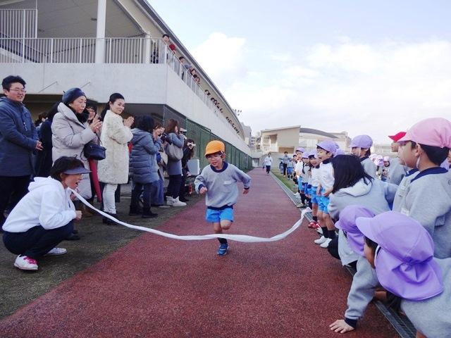 最後は年長児です。やる気満々のオーラが漂っています。男女別にスタートしました。グランド2周、1㎞近く走ります。歯を食いしばって走る子、悠々としている子、休憩しては又走り出す子等、いろいろな姿がありましたが、みんな頑張っていました。ゴール前には、小さい組さんや保護者の方が「頑張れ」と声を挙げながら待って下さっています。応援に励まされながらみんなゴールすることができました。ゴールの時は、ホット様子でどの子もにこにこ笑顔でした。