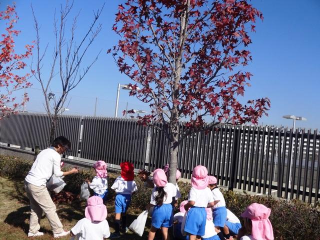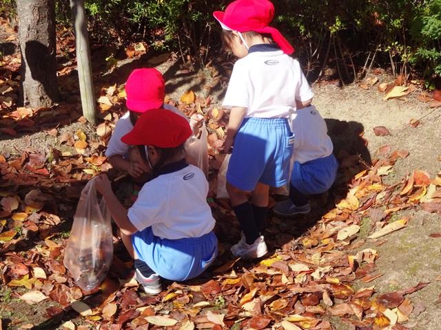 紅葉の季節、3歳児はみんなで、学園内に落ち葉拾いに行きました。桜の落ち葉をみつけると「あそこー」とフカフカの落ち葉の中に入って拾います。「みてみていっぱい」袋の中に入れたたくさんの落ち葉を見せてくれます。3歳児は、きれいな葉っぱを選んで集めることよりもたくさん集めることが嬉しいのです。袋いっぱいに集めた落ち葉を自慢げに見せてくれました。