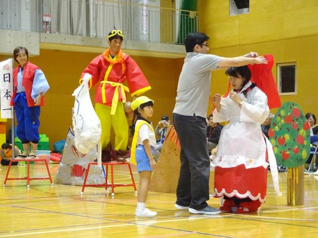 年長組は「ミラクル・チェンジ」お話に出てくる登場人物に服やアイテムを付けて仕上げていきます。「どれを着せたらいいのかな」親子で選ぶ姿が微笑ましいです。桃太郎・孫悟空・赤ずきん・かぐや姫に変身♪楽しい競技でした。