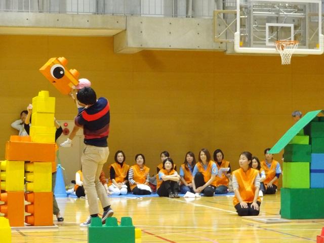 年少組は、遠足でレゴランドに行った経験を生かし、「レゴブロック」の競技です。床一面に散らばったレゴの中から1つを選び、家・キリン・ロボット・クジラなどをつくっていきます。高いところは、おとうさんに抱っこしてもらってくっつけます。とっても嬉しそう♪