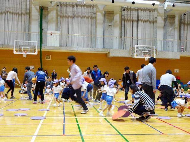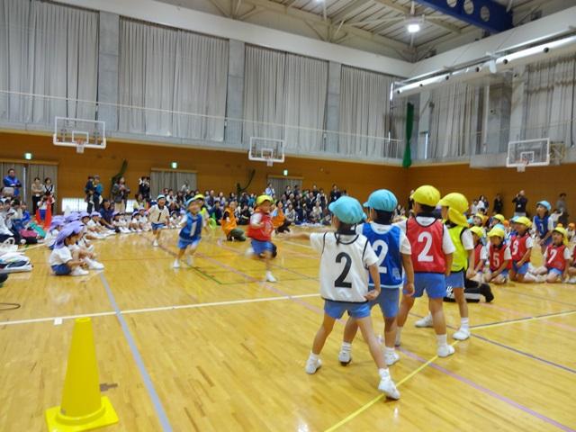 年中組は「ひっくりオセロ」クラス対抗で、巨大オセロをひっくり返していきます。親も子もみんな一生懸命!とても体力のいる競技でした。お父様、お母様お疲れ様でした。