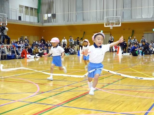 年少組は、初めての運動会です。園庭から体育館に代わって「大丈夫かな」と思いましたが、なんのその…かけっこでは、元気いっぱいゴール目指して走りきりました。