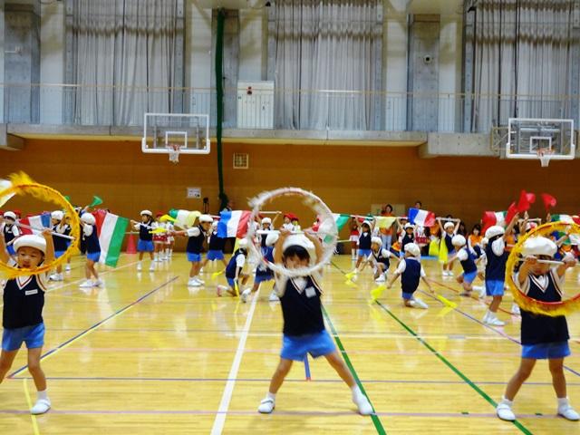 奈良学園幼稚園運動会の見どころの1つは「Pre Primary マーチングバンド」年長児はマーチング、年中児はフラッグ、年少児はポンポンでコラボします。運動会に向けて一生懸命に練習を重ねてきました。年長児のマーチングでは、みんな真剣な表情で心を合わせで楽器を演奏しました。隊形移動もお見事でした。年中児は、フラッグ・リング・カラーガードをもってリズムにのって心を弾ませながら元気いっぱいに踊りました。最後ににこにこ笑顔の年少児がポンポンをもって登場し演技は終了。会場からは拍手が鳴り響きます。この拍手が、子どもたち心の根っこを強く太くするのです。大きな自信を得た子どもたちです。 続く