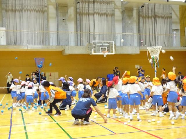体育館は超満員。たくさんの家族の皆様、卒園生、未就園児親子が応援に来て下さいました。