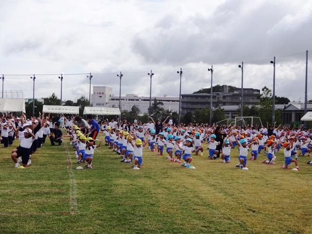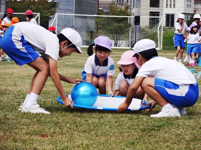 園児は、年少・年中児がP4(小4生)と交流します。事前に一緒に練習し、外でするのは初めてです。入場門に整列している時からP4生は、園児に優しく話しかけたり、手を繋いだりしてくれていました。小さい子を見る眼差しや表情がとっても優しく、園児も安心して競技に参加することができました。