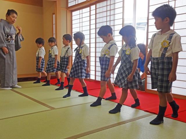 「真のお辞儀」を教えていただきました。手の指はくっつけて頭を下げてね」「そうそう上手ですよ」と褒めてもらうと、より頑張ろうとするのです。そして、足の運び方も教えていただきました。
