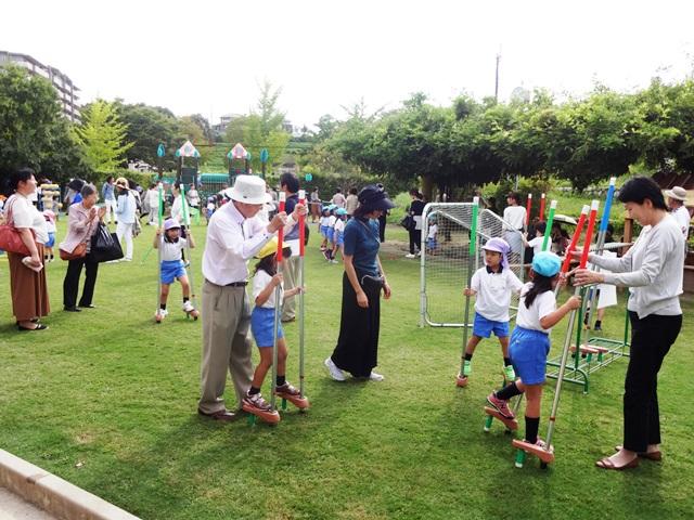 「昔の遊びコーナー」には、こま・けん玉・おはじき・メンコ・あやとり、竹馬などを準備しました。おじいちゃん・おばあちゃんに遊び方を教えてもらいながら、初めての遊びに挑戦していました。棚田では、ドングリの実やじゅず玉を見付けたり、つゆ草を摘んだりして秋の自然に触れて楽しむ姿もみられました。