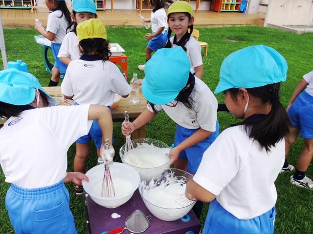 年中・年長組の子どもたちは、シャボン玉を飛ばしたり、泡遊びに夢中になる姿がみられました。「みて、とろとろになった」一生懸命に撹拌して泡をたてると粗い泡からだんだんメレンゲのような滑らかな泡になります。一生懸命遊んで、科学の不思議を学ぶ子どもたちです。