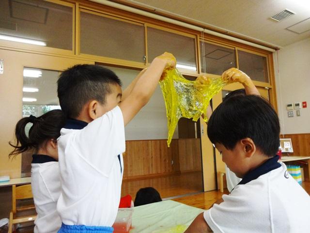 年少組みでは、寒天粘土やスライムが用意され、子どもたちはスィーツをつくったり、手にくっついたスライム伸ばして「ワァーおもしろい」と友達と笑い合ったりして楽しんでいました。