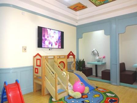 室内は国際色豊かでファンタジーな世界が広がる内装でした。英語教育を取り入れ、英語の先生も常勤されています。遊具・用具は、色彩も柔らかく、安全性も重視され、低年齢児に適応したものが設置されていました。