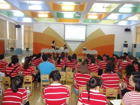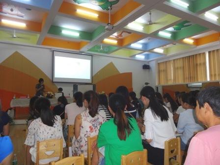 早速、講義がはじまりました。教員の皆様に「教員としての心構え」というテーマで話を進めました。私の園の先生たちの仕事の様子を動画でみてもらいました。通訳の方が歌詞を中国語に変換して下さっていたので、中国の先生もわかりやすかったのでしょう。楽しそうな表情で視て下さいました。
