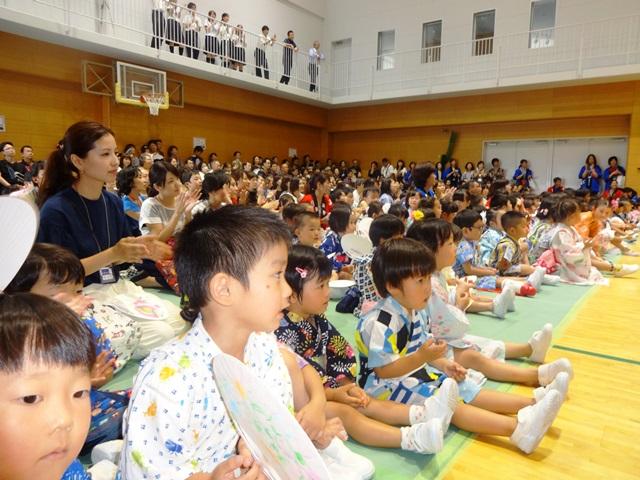 夏のお祭りらしく浴衣や甚平を着た子どもたちが、保護者と一緒に登園してきました。