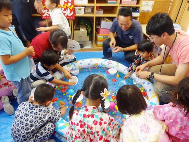 園に戻ると「夏祭り」の雰囲気がいっぱいです。役員さん手作りの「おさかなつり・ガブッとワーニング」や「ワニワニパニック」などのゲームにみんなキャッキャ言いながら楽しんでいました。