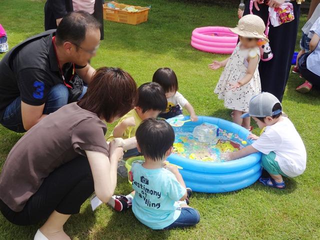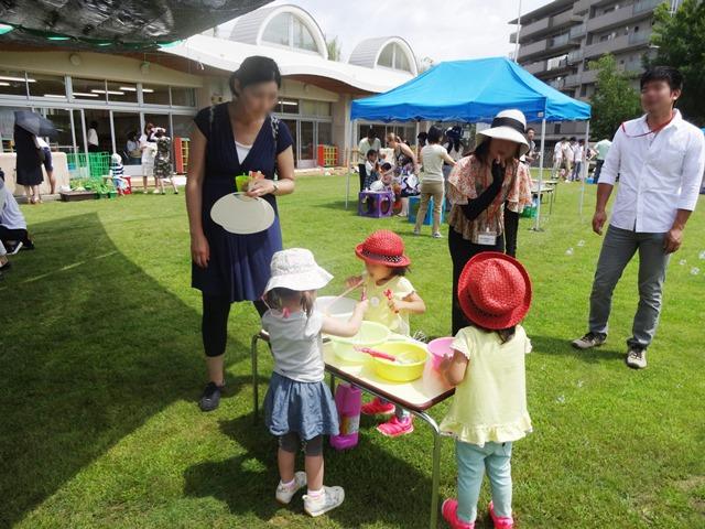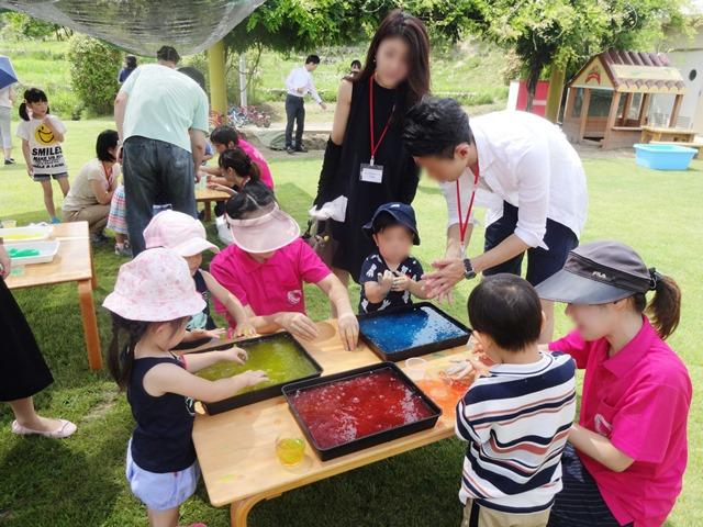 園庭には、シャボン玉や水鉄砲・スライム・寒天粘土・色水遊び等のコーナーを設けました。大きなシャボン玉をおうちの方と一緒に飛ばして笑顔いっぱいの子、初めてのスライムや寒天粘土に「ワァー冷たい!」と歓声を上げ、伸ばしたり丸めたりして…その感触を楽しむ子、プールの中のアヒルを沈めたり浮かべたりして楽しむ子等…、園庭は子どもたちの歓声で賑わっていました。