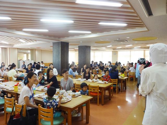 学園のPダイニングに集まっていただき、本園の園児たちが食している給食を食べていただきました。本日のメニューは唐揚げ・味噌汁・酢の物・ご飯・ヨーグルトでした。給食を作っていただいている魚国総本社さんから食の安全についてお話をいただき、みんなで「いただきます!」。