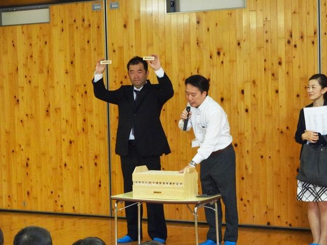 遊戯室に集まった子どもたちは、匠の会の方から奈良の檜の木を使って作った積み木の話を聞き、みんなで楽しく遊んで下さいと言うメッセージと共に贈呈していただきました。