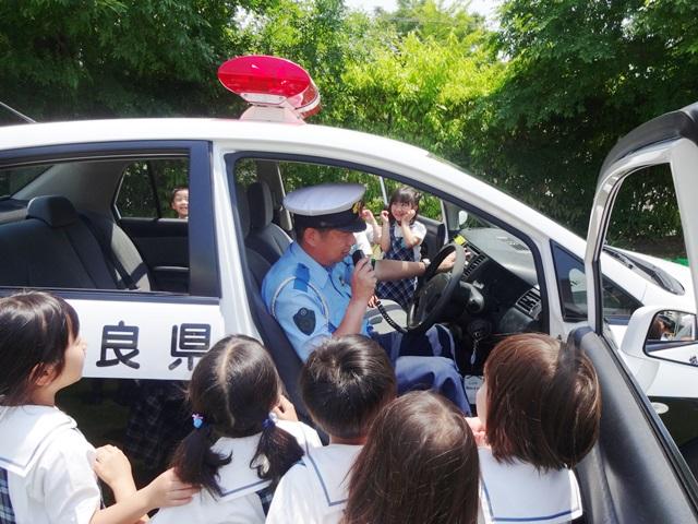 パトカーが園に到着するとみんな駆け寄っていきます。お回りさんが優しくパトカーの仕組みを教えて下さいました。