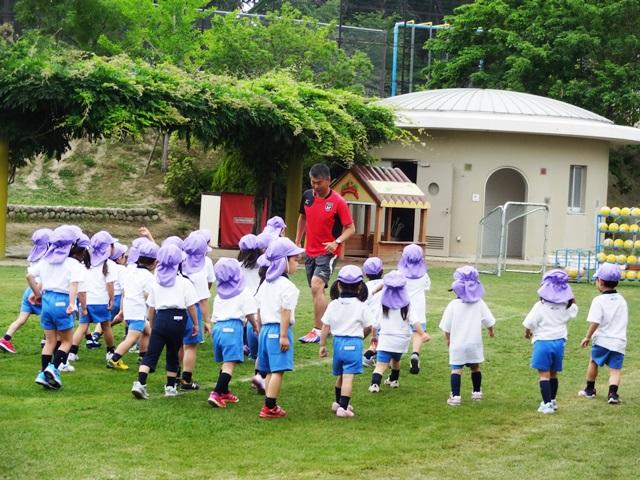次は年少組の時間です。幼稚園に入園して始めてのサッカーです。まずはM先生とかくれんぼ♪